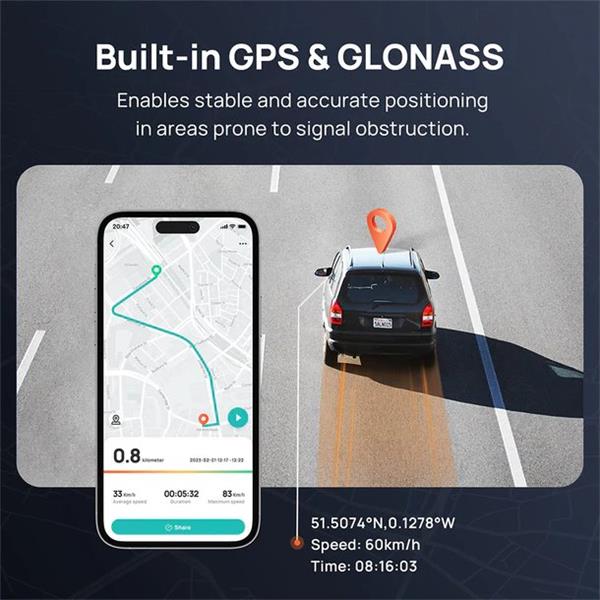 Polohovací systém M500 přijímá signály ze satelitů GPS i GLONASS, což umožňuje stabilní a přesné určování polohy i v oblastech náchylných k rušení signálu. Údaje o cestě zahrnují čas, rychlost (km/h, mph) a souřadnice – zásadní pro silniční asistenci a pojistná plnění v případě nehody.