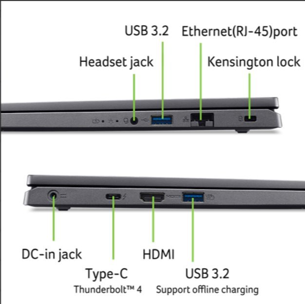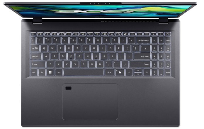 Aspire 16 (A16-71GM-76JL) - Windows 11 Home - Intel® Core™ Ultra 7 processor 155H - 8GB DDR5 Memory On Board + 8 GB DDR5 Memory (up to 5600MHz) - 1024GB PCIe NVMe SSD PM4 + N (M.2) - 16" WUXGA 1920x1200 16:10 IPS Anti-Glare - NVIDIA® GeForce RTX™ 3050 6G-GDDR6 (2C*512*16*3) 16Gbps - WIFI 6E Intel 802.11ax 2x2 MU-MIMO + BT 5.3 LE Audio - FHD USB TNR Camera with 2Mic. - Backlight KB - Finger Print on Touchpad - 2x USB 3.2 Gen1 - 2x USB Type-C port supporting: USB4 ® 40Gbps / Display port over USB-C / Thunderbolt™ 4 / USB charging 5 V; 3 A / DC-in port 20 V; 100 W - HDMI 2.1 - RJ-45 - Copilot Key (AI) - Acer Sense App - 65Wh Li-ion battery - 100W USB Type-C AC Adapter PCR50% TCO9.0 - Steel Gray + Steel Gray Aluminum LCD cover