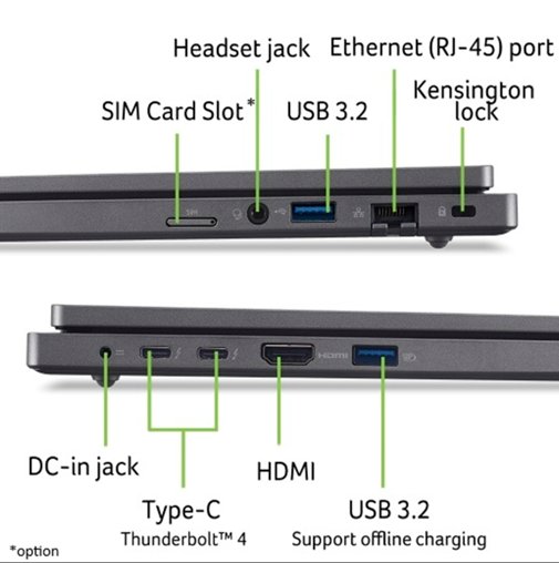 TravelMate P2 14 (TMP214-75-G3-TCO-565F) - Windows 11 Professional 64bit - Intel® Core™ Ultra 5 processor 125H - 16 GB DDR5 Memory + N - 512 GB PCIe NVMe SSD + N/A - Micro SD card reader - 14" WUXGA 1920x1200 16:10 IPS Anti-Glare - Intel® Graphics - WiFi 6E Intel 802.11ax 2x2 CNVi + BT 5.3 - FHD IR TNR Camera with 2Mic. with shutter - Backlight KB - Finger print on TouchPad - Smart Card reader - 2x USB 3.2 Gen1 - 2x USB Type-C port supporting: USB4® 40 Gbps / Display port over USB-C / Thunderbolt™4 / USB charging 5 V; 3 A / DC-in port 20 V; 65 W - HDMI 2.0 - RJ-45 - chip TPM 2.0 - 53Wh Li-Ion battery - 65W USB Type-C AC Adapter PCR50% TCO10.0 - Acer Dust Defender - MIL-STD 810H certified - TCO certification - Steel Gray