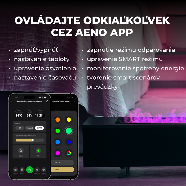 External Color: Black Smart Heater Type: Electric heater and air humidifier Operating Temperature Min: 16 °C Operating Temperature Max: 40 °C Voltage: AC 230 V, 50/60 Hz Dimension: 242 x 170 x 1000 mm Nominal Weight: 10.9 kg Cord Length (m): 1.9 m Built-in Devices: Temperature Sensor Humidity Sensor Tilt Sensor Voice Assistant Support: Siri Amazon Alexa Google Assistant Features: Overheat Protection Certificate: CE, ROHS, REACH Heating element type: Convection Mounting type: Portable, floor standing Heating power steps: 2 (1000+1000) Type of plug: E/F Heating area, m2: up to 50 REAL FIRE effect (water, humidity): Yes, 12 colors, up to 72 hours Number of colors possible: 65000 Water tank volume, L: 2 Device working modes: Constant heating, Smart Heating, REAL FIRE effect, Humidification Local control: 2,8" IPS Color Display + 6 buttons and rotary knob Remote control: AENO App Wifi: 2.4 to 2.4835 GHz Easy control: Rotational knob native interface Power consumption statistics: Yes, with AENO App Inbuild air humidifier: Yes, ultrasonic Temperature of different modes: 24°C (default value in SMART mode) Power Input Voltage: AC 230 V Input Frequency: 50/60 Hz Rated Input Current: 10 A Maximum Output Power: 2000 W Dimensions & Weight Depth (mm): 242 mm Height (mm): 170 mm Width (mm): 1000 mm Nominal Weight: 10.9 kg Environment Protection Standarts: IP20 Aplikácia AENO – interakcia s inými produktmi AENO