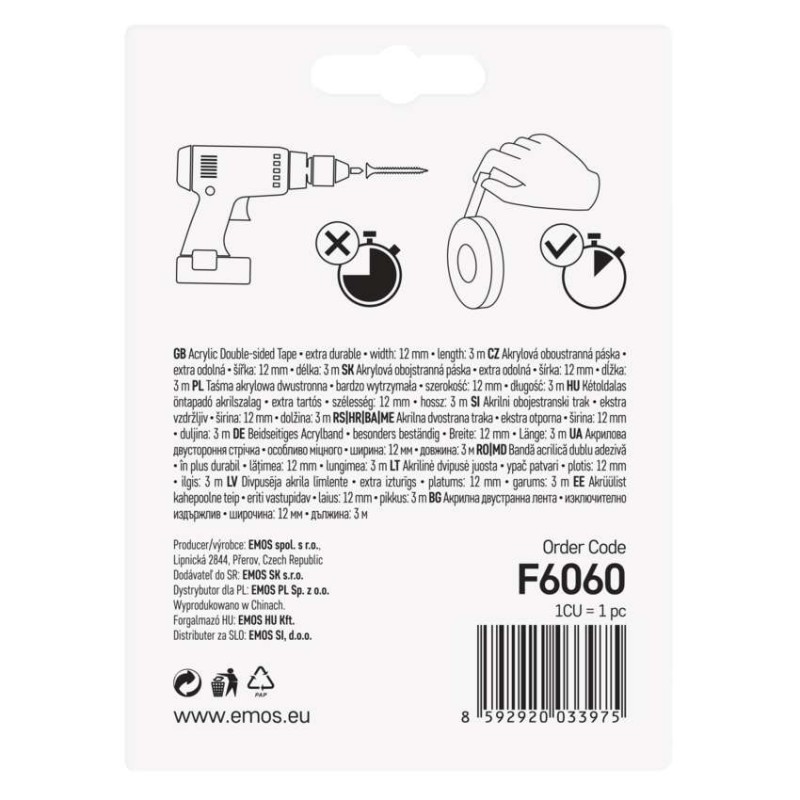 dĺžka návinu: 3 m|elektrická pevnosť minimálne: neuvádza sa|elektrická pevnosť po vlhku minimálne: neuvádza sa|farba: číra|hrúbka pásky: 1,00 mm|integrovaná textilná sieťka: neuvádza sa|materiál lepidla: akryl|odolné UV: áno|odporúčaná skladovacia teplota: 5–40 °C|pevnosť v ťahu: neuvádza sa|potlač: bez potlače|predajný obal: 1 ks, blister|predĺženie minimálne: neuvádza sa|predpokladané použitie: hobby, dielňa, záhrada|priľnavosť k oceli minimálne: neuvádza sa|priľnavosť k podkladu: 2 kg/30 cm|rozmer: 88 × 12 mm|rozsah inštalačných teplôt: 5–40 °C|samozhášavé: áno|šírka pásky: 12 mm|skúška plameňom: neuvádza sa|spĺňa smernicu REACH: neuvádza sa|spĺňa smernicu ROHS: neuvádza sa|typ pásky: akrylová obojstranná páska|vodotesný spoj: neuvádza sa|vyhovuje norme: neuvádza sa|vytvára tlakotesný spoj: nie