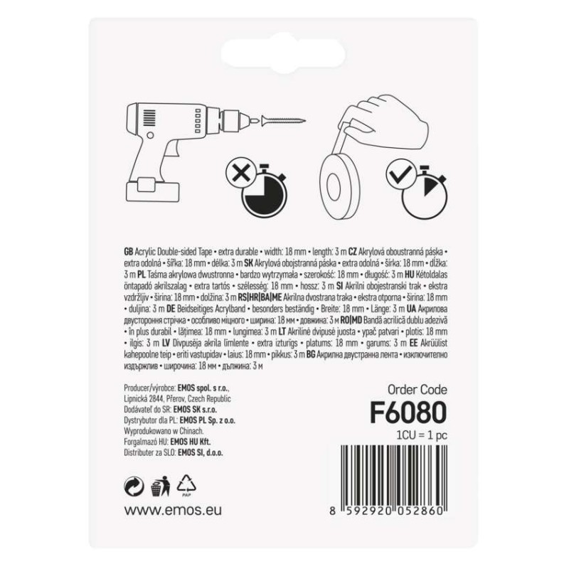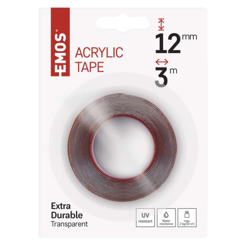 dĺžka návinu: 3 m|elektrická pevnosť minimálne: neuvádza sa|elektrická pevnosť po vlhku minimálne: neuvádza sa|farba: číra|hrúbka pásky: 1,00 mm|integrovaná textilná sieťka: neuvádza sa|materiál lepidla: akryl|odolné UV: áno|odporúčaná skladovacia teplota: 5–40 °C|pevnosť v ťahu: neuvádza sa|potlač: bez potlače|predajný obal: 1 ks, blister|predĺženie minimálne: neuvádza sa|predpokladané použitie: hobby, dielňa, záhrada|priľnavosť k oceli minimálne: neuvádza sa|priľnavosť k podkladu: 2 kg/30 cm|rozmer: 88 × 18 mm|rozsah inštalačných teplôt: 5–40 °C|samozhášavé: áno|šírka pásky: 18 mm|skúška plameňom: neuvádza sa|spĺňa smernicu REACH: neuvádza sa|spĺňa smernicu ROHS: neuvádza sa|typ pásky: akrylová obojstranná páska|vodotesný spoj: neuvádza sa|vyhovuje norme: neuvádza sa|vytvára tlakotesný spoj: nie