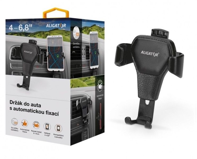 "Univerzální držák pro mobilní telefony do auta ve velmi elegantním provedení nebrání řidiči ve výhledu a je kompatibilní s většinou mřížek ventilátorů.Automatický systém fixace vloženého mobilního telefonu. Při vkládání do držáku je telefon vlastní vahou zafixován pomocí bočních čelistí."