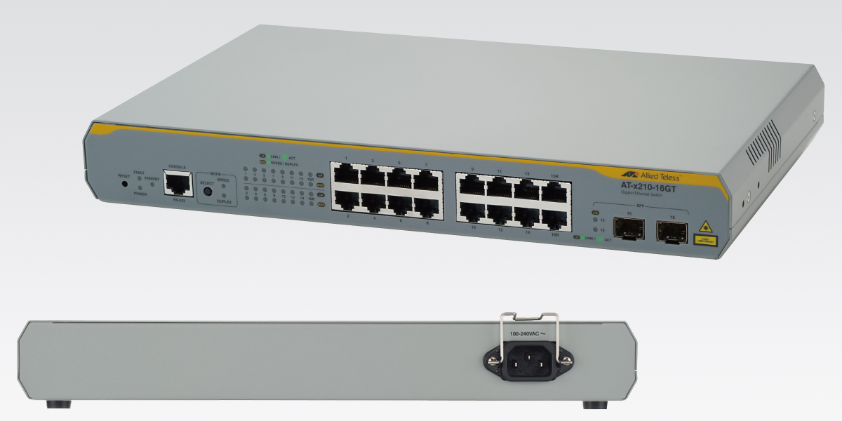 AT-x210-16GT Enterprise Edge Switch OVERVIEW The Allied Telesis AT-x210-16GT features 14 x 10/100/1000T ports and 2 x Gigabit-SFP combo uplink ports for network access applications and provides an impressive set of features in an affordable package. Th...