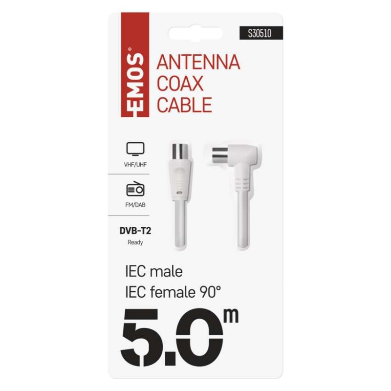dĺžka: 5 m|konektory: IEC vidlica – IEC zásuvka|materiál: PVC|počet tienení: 2|predajný obal: 1 ks, blister|typ konektorov: 1× priamy, 1× uhlový