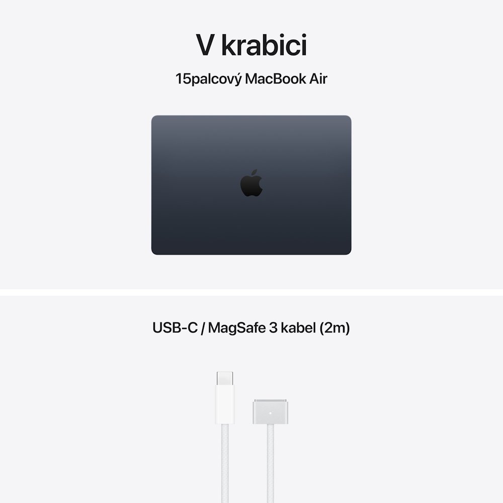 15palcový MacBook Air, USB-C / MagSafe 3 kabel (2 m). Napájecí adaptér není součástí balení.