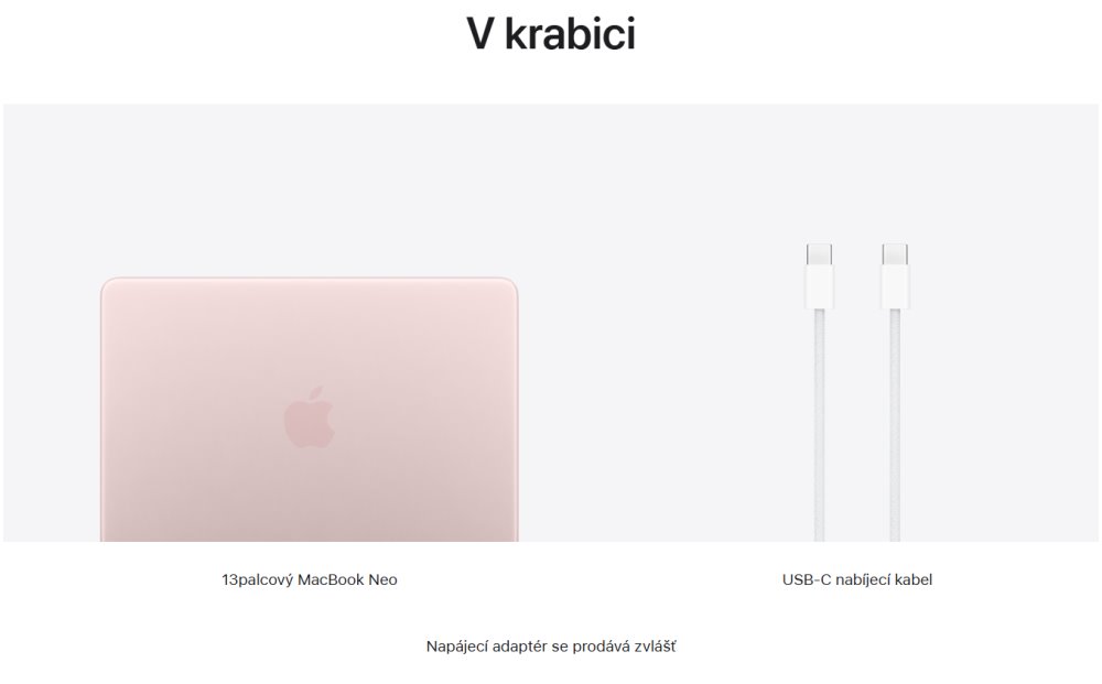 MacBook Neo, USB-C nabíjecí kabel (1,5 m). Napájecí adaptér se prodává zvlášť, minimální příkon pro nabíjení je 20 W.