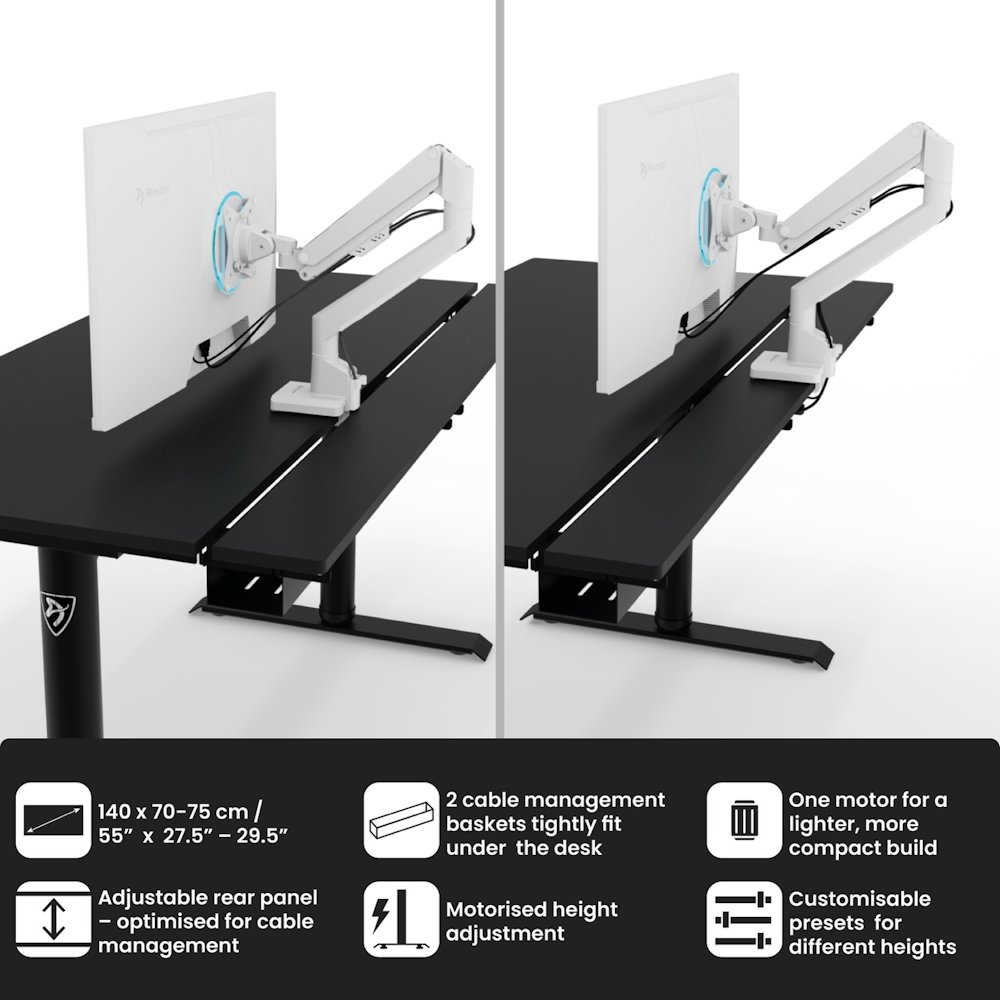 Díky kompaktnímu motoru a robustní ocelové konstrukci nabízí spolehlivý provoz při zachování lehčí a elegantnější stavby. Nastavitelný zadní panel umožňuje optimální umístění monitorů a efektivní vedení kabelů, zatímco dva kovové košíky se snadno montují pod desku pomocí rychloupínacích držáků.