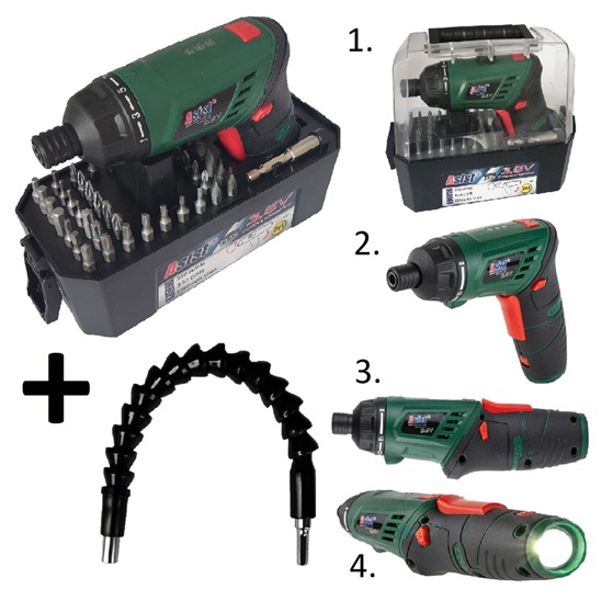 Baterie: 1300 mAh Li-ion Otočné držadlo s reflektorem Doba nabíjení: 3-5 h (USB) Otáčky naprázdno: 0-200 ot/min Maximální kroutící moment: 5Nm Levý/pravý směr otáčení Ukazatel stavu nabití, LED světlo