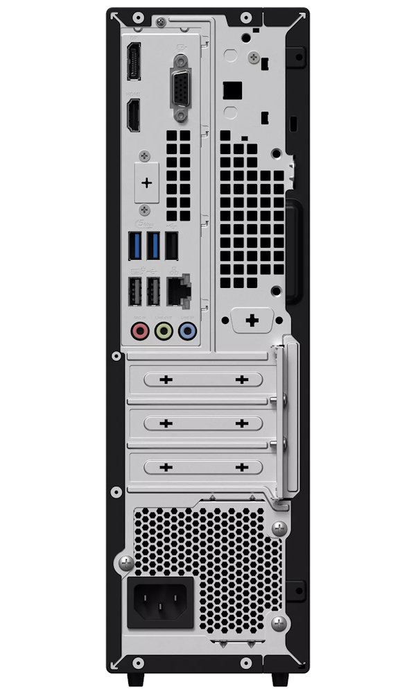 Zadní panel obsahuje RJ-45 Gigabit Ethernet, HDMI 1.4, VGA, DisplayPort 1.4, 7.1kanálové audio (mikrofon, line-out, line-in), 3× USB 2.0, 2× USB 3.2 Gen1 a FLEX I/O port (HDMI 2.1 TMDS). Přední panel nabízí 3,5mm combo audio jack, sluchátka, 2× USB 2.0, 1× USB-C 3.2 Gen2, 2× USB 3.2 Gen2 a čtečku SD/MMC karet.