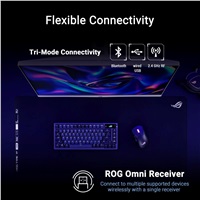 • Ultrarýchly bezdrôtový výkon: Všestranné možnosti pripojenia: 2,4GHz bezdrôtové RF, Bluetooth a káblové USB; pribalený prijímač ROG Omni podporuje bezdrôtové pripojenie viacerých zariadení pomocou jediného prijímača