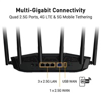 • Štyri porty 2,5 GbE – Porty 2,5 GbE uprednostňujú prevádzku a optimalizujú káblové pripojenie k internetu pre maximálny výkon.