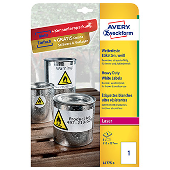 Avery Zweckform etikety 210mm x 297mm, A4, biele, 1 etiketa, veľmi odolné, balené po 8 ks, L4775-8