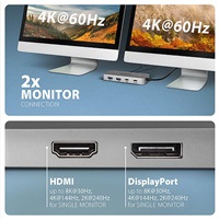 Dokovací stanice nabízí dva video výstupy – HDMI a DisplayPort umožňují připojení externích monitorů, televizorů nebo projektorů s rozlišením až 8K/30Hz Ultra HD. Podporována jsou také další rozlišení, například 4K/144Hz Ultra HD, 2K/240Hz Quad HD nebo 1080p/240Hz Full HD a přenos vícekanálového zvuku přes HDMI. Při současném zapojení dvou monitorů poskytuje rozlišení 4K/60Hz na každém z nich. Díky podpoře HDR (High Dynamic Range) si uživatelé mohou vychutnat výrazně širší rozsah barev a vyšší kontrast, což ocení při práci i zábavě.