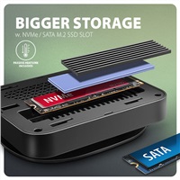 NVME alebo SATA M.2 SSD disk môžete pripojiť vďaka zabudovanému slotu v hornej časti hubu. Viacportový rozbočovač sa tak stáva aj externým diskom. Karty M.2 môžu byť jednostranné alebo obojstranné s rozmermi 22x42, 22x60 a 22x80 mm. Externé úložisko M.2 nemá žiadne limity kapacity SSD, podporuje funkcie TRIM a UASP a umožňuje čítanie informácií S.M.A.R.T. na monitorovanie stavu disku.