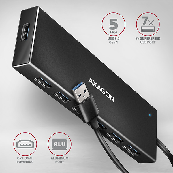 • AXAGON HUE-F7A, 7x USB 3.2 Gen 1 ALU FLAT CHARGING hub, micro USB napájecí konektor, kabel USB-A 1m