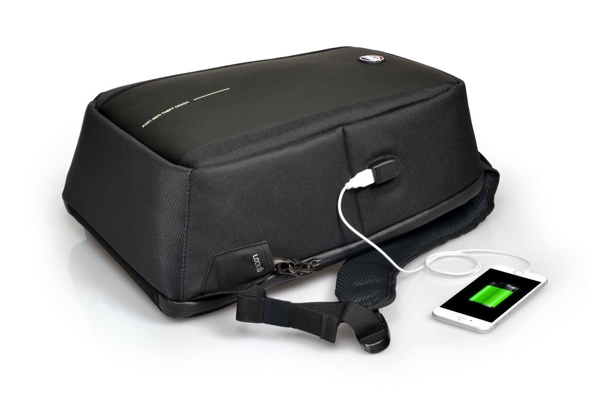 Design batohu zabrání zlodějům v otevření hlavní kapsy. Voděodolné zipy jsou totiž uzamykatelné. Na boku batohu se nachází karabinka na gumě, která chytí jezdce zipů. Bezpečnostní ramenní popruhy zabrání zlodějům ve strhnutí batohu, neboť posuvný popruh je zajištěný proti pohybu.