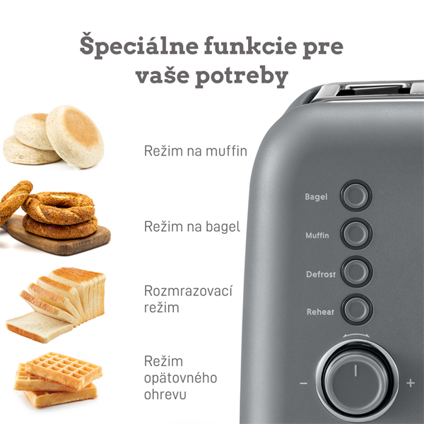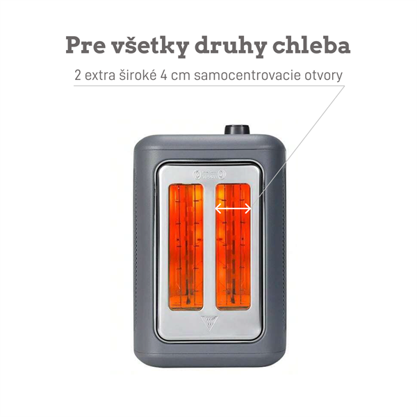 Vylepšené 4 cm široké otvory s motorizovaným zdvihom sú ideálne pre rôzne druhy plátkov, od hrubých bagelov až po tenký chlieb. Páka s vysokým zdvihom tiež uľahčuje vyberanie aj tých najmenších kúskov hrianok.