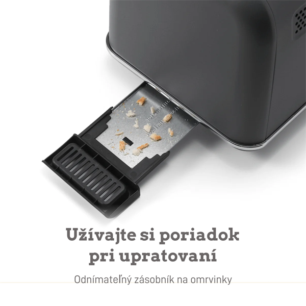 Hriankovač je vybavený praktickými výsuvnými miskami na omrvinky umiestnenými v zadnej časti, ktoré sa dajú bez námahy vybrať a vyčistiť. Tento premyslený konštrukčný prvok umožní ľahšie odstránenie omrviniek a zvyškov, čím sa zabráni ich hromadeniu a zachová sa výkon hriankovača. Toto jedinečné riešenie udrží váš hriankovač dlho v excelentnom stave.