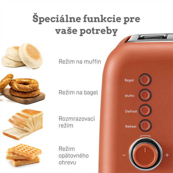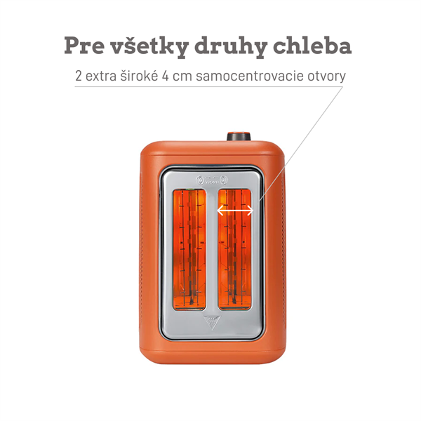 Vylepšené 4 cm široké otvory s motorizovaným zdvihom sú ideálne pre rôzne druhy plátkov, od hrubých bagelov až po tenký chlieb. Páka s vysokým zdvihom tiež uľahčuje vyberanie aj tých najmenších kúskov hrianok.