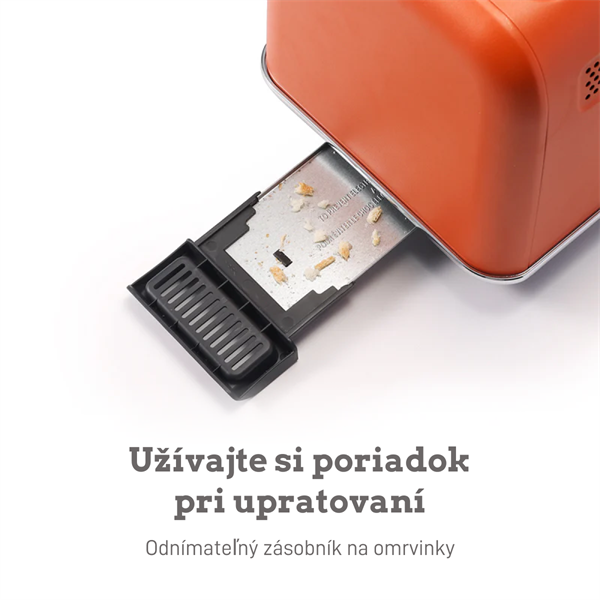 Hriankovač je vybavený praktickými výsuvnými miskami na omrvinky umiestnenými v zadnej časti, ktoré sa dajú bez námahy vybrať a vyčistiť. Tento premyslený konštrukčný prvok umožní ľahšie odstránenie omrviniek a zvyškov, čím sa zabráni ich hromadeniu a zachová sa výkon hriankovača. Toto jedinečné riešenie udrží váš hriankovač dlho v excelentnom stave.