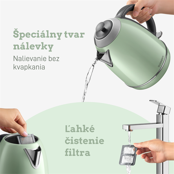 Tento spotrebič s pôsobivým príkonom 1440 W dokáže rýchlo premeniť studenú vodu na vriacu za menej ako päť minút. Vďaka takejto vysokej účinnosti môžete rýchlo pripravovať horúce nápoje, variť instantné jedlá alebo sterilizovať vodu, čo vám ušetrí drahocenný čas pri každodennej práci. Výkon kanvice z nej robí nenahraditeľný nástroj v každej kuchyni, ktorý poskytuje pohodlie a spoľahlivosť vždy, keď ho potrebujete.
