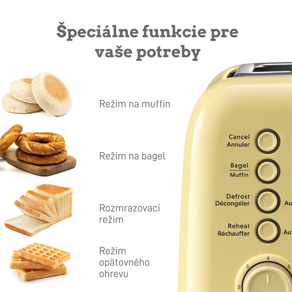 7 úrovní opečenia pre 5 základných funkcií s kontrolkami LED. Okrem opekania klasického pečiva, ako sú bagely, chlieb, vafle a múčniky, môžete tiež ohrievať a rozmrazovať. Uspokojí všetky vaše každodenné potreby v oblasti hriankovania.