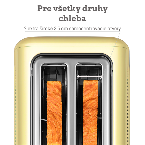 2 široké (3,5 cm) štrbiny so samostrediacimi vodidlami, ideálne pre rôzne druhy krajcov. Vždy dokonalá zlatohnedá hrianka.