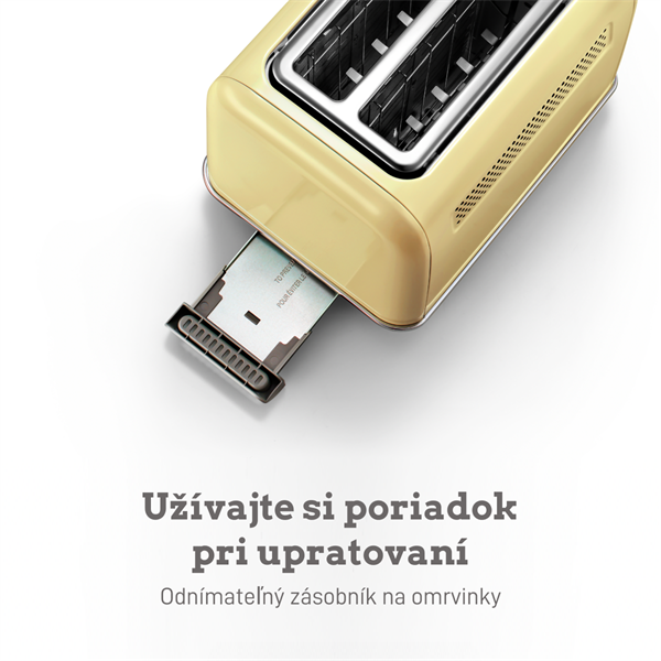 Výsuvná miska na omrvinky za hriankovačom sa dá ľahko vybrať a vyčistiť. Toto jedinečné riešenie udrží váš hriankovač dlho v dobrom stave.