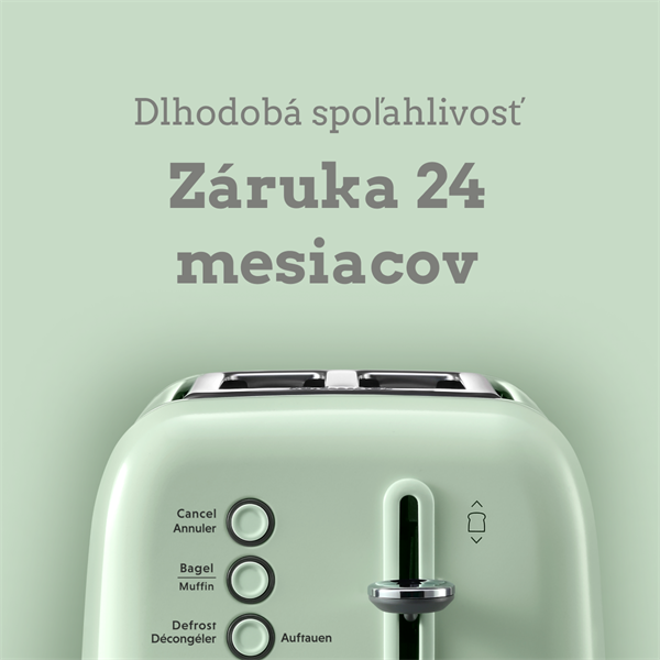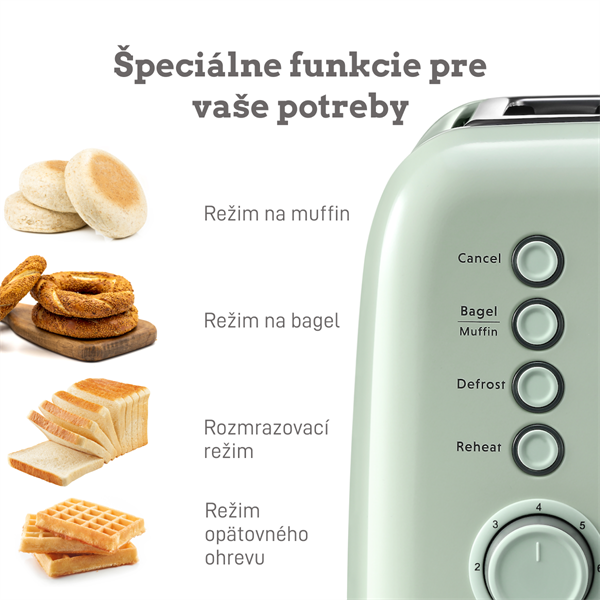 7 úrovní opečenia pre 5 základných funkcií s kontrolkami LED. Okrem opekania klasického pečiva, ako sú bagely, chlieb, vafle a múčniky, môžete tiež ohrievať a rozmrazovať. Uspokojí všetky vaše každodenné potreby v oblasti hriankovania.