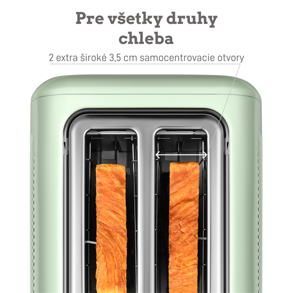 Tento hriankovač je vybavený dvoma štrbinami so šírkou 3,5 cm, ktoré sú vybavené samostrediacimi vodidlami. Tieto vodidlá zaistia, že rôzne druhy chleba, od hrubých domácich bochníkov až po tenký sendvičový chlieb, budú dokonale zarovnané a rovnomerne opečené. Či už dávate prednosť ľahko zlatistej chrumkavej alebo sýtej hnedej prepečenej verzii, tento hriankovač vám zakaždým pripraví dokonalé hrianky, vďaka čomu sa vaše raňajky stanú potešením.