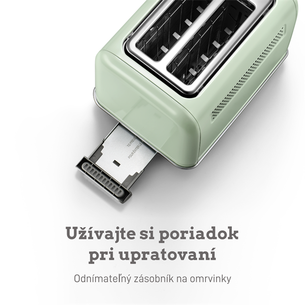 Hriankovač je vybavený praktickou výsuvnou miskou na omrvinky umiestnenou v zadnej časti, ktorá sa dá bez námahy vybrať a vyčistiť. Tento premyslený konštrukčný prvok umožní ľahšie odstránenie omrviniek a zvyškov, čím sa zabráni ich hromadeniu a zachová sa výkon hriankovača. Toto jedinečné riešenie udrží váš hriankovač dlho v excelentnom stave.