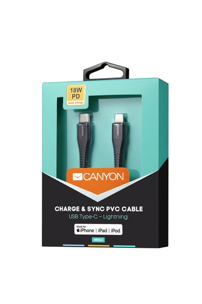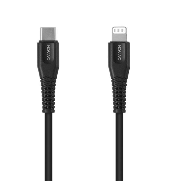Canyon CNS-MFIC4B, 1.2m kábel USB-C / Lightning, 5V/2.4A, priemer 3.5mm, PVC, čierny