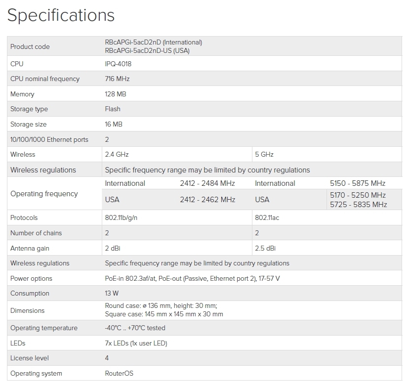 cAP ac with 716MHz CPU, 128MB RAM, 2 x Gbit LAN (o, cAP ac with 716MHz CPU, 128MB RAM, 2 x Gbit LAN RBCAPGI-5ACD2ND