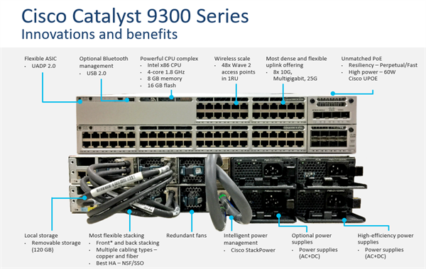 Séria Catalyst 9300 je navrhnutá pre technológiu Cisco StackWise ® , ktorá poskytuje flexibilné nasadenie s podporou nonstop presmerovania pomocou Stateful Switchover (NSF/SSO), pre najodolnejšiu architektúru v stohovateľnom (pod 50 ms) riešení. Vysoko odolná a efektívna architektúra napájania je vybavená portami Cisco StackPower ® , ktoré poskytujú porty Power over Ethernet Plus (PoE +) s vysokou hustotou, 60 W Cisco Universal Power over Ethernet (Cisco UPOE) a 90 W porty Cisco UPOE ® +. Prepínače sú založené na Cisco Unified Access ™Architektúra Data Plane 2.0 (UADP), ktorá nielen chráni vaše investície, ale umožňuje aj väčší rozsah a vyššiu priepustnosť. Modely Catalyst 9300X sú založené na novom ASIC, UADP 2,5 s, ktorý pridáva podporu Crypto v hardvéri vrátane IPSEC. Cisco IOS ® XE s moderným operačným systémom s programovateľnosťou ponúka pokročilé možnosti zabezpečenia a konvergenciu internetu vecí (IoT).