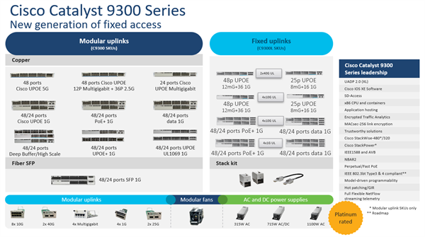 * Flexibilné a husté ponuky uplinkov s 1G, multigigabitovými, 10G, 25G, 40G a 100G vo forme pevných alebo modulárnych uplinkov