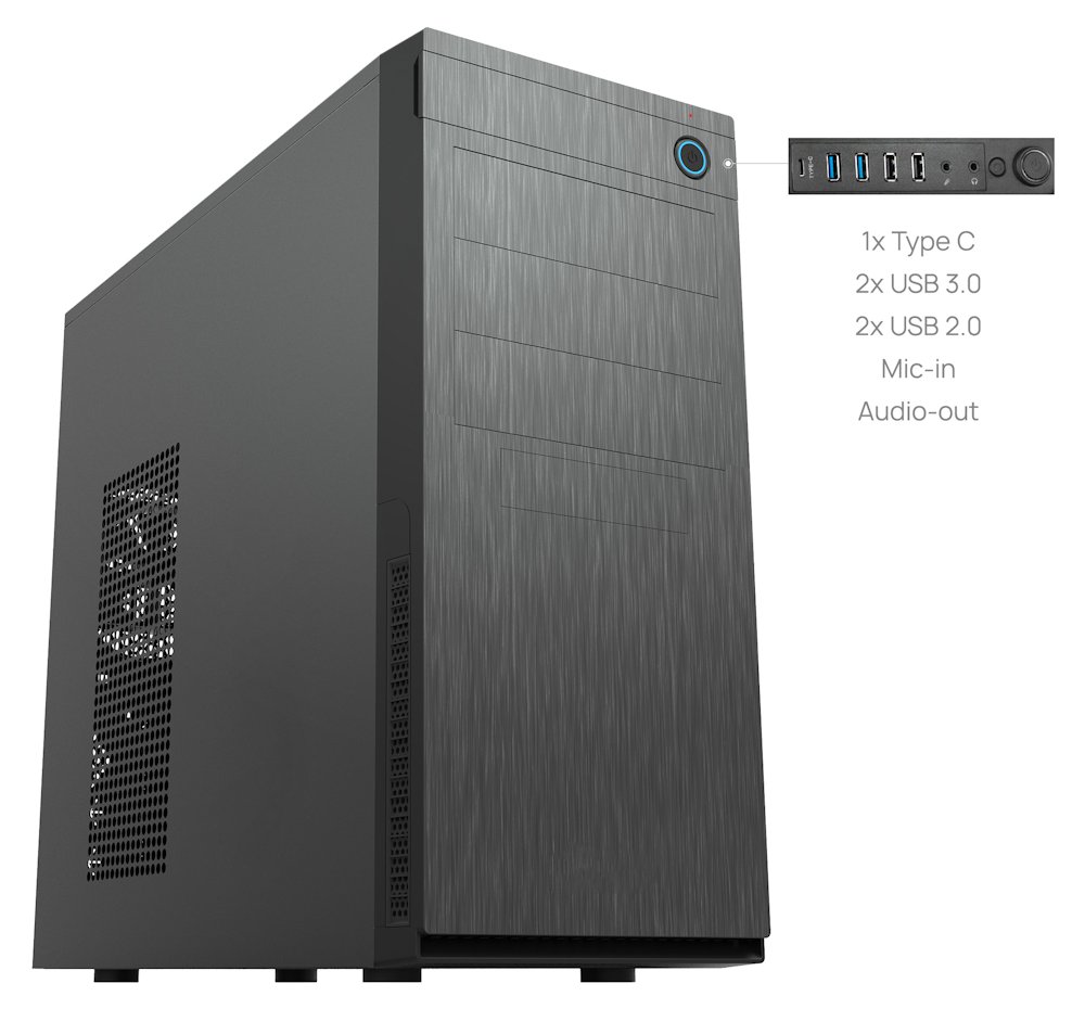 Počítačová skříň v moderním designovém provedení s broušeným efektem nabízí jednu 2,5" pozici pro SSD disky a čtyři 3,5" pozice pro pevné disky. Na čelní straně se pod horní krytkou nachází dva USB 3.0, dva USB 2.0 a jeden USB-C port (USB 2.0 verze 480 Mbit/s). K dispozici je také sluchátkový výstup a vstup pro mikrofon. Skříň je možno osadit předním a zadním ventilátorem. Ve skříni je dostatek prostoru pro chladič CPU do výšky až 155 mm a grafickou kartu o délce až 250 mm. Po demontáži klece pro dva 3,5" HDD, je možné využít grafickou kartu o délce až 380 mm. Skříň je dodávána bez zdroje.