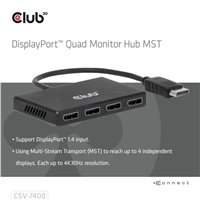 Club 3D CSV-7400 vám umožní pripojiť až štyri displeje z jedného zdroja DisplayPort. Podporuje súčasný výstup štyroch obrazoviek v rozlíšení 4K pri 30 Hz, čím je ideálnym riešením pre multitasking, vyššiu produktivitu alebo rozšírený pracovný priestor.