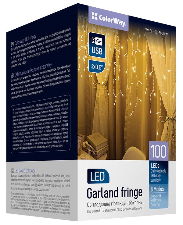 ColorWay CW-GF-100L36UWW; LED girlanda poslouží jako skvělá dekorace pro všechny příležitosti. Obsahuje 100 teple bílých LED rozmístěných na ploše 3× 0,6 metru . Samozřejmostí je možnost zvolit si jeden z...