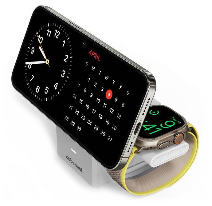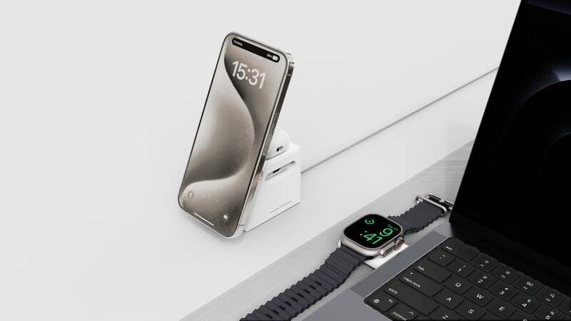 Praktická bezdrátová nabíječka nabízí tři nabíjecí plochy, díky čemu umožňuje nabíjet současně telefon, hodinky i sluchátka celkovým výkonem až 20 W. Díky technologii MagSafe (verze iPhonů 12 a vyšší) se telefon magneticky zarovná a začne nabíjet. Samozřejmostí je ale také kompatibilita s nabíjecím standardem Qi. Velkou předností je možnost nabíjet hodinky ostatních značek. Stačí váš kabel připojit do bočního USB-C portu nabíjecí kostky a můžete pohodlně nabíjet i vaše chytré hodinky. Nabíječku na Apple Watch lze snadno odpojit a připojit do jiného USB-C portu, například do MacBooku. Nízké těžiště a protiskluzová podložka zajistí stabilitu při používání telefonu, zatímco silný magnet udrží telefon pevně na místě v průběhu i po nabití. Nabíječka navíc automaticky vypne nabíjení po plném nabití vašeho zařízení.