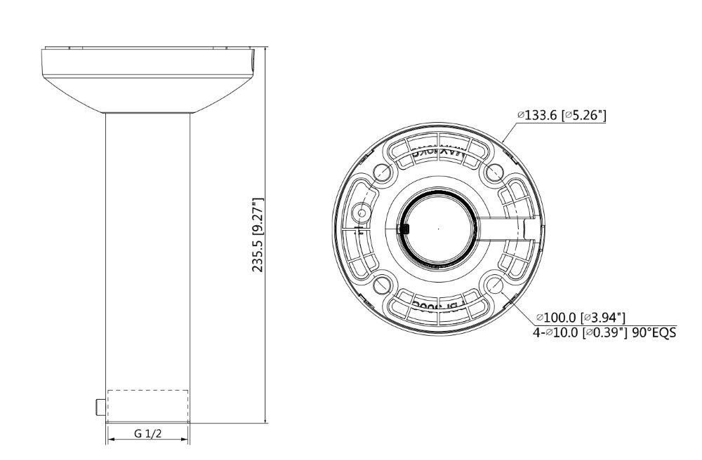 Dahua PFB300C; Stropní odsazení pro montáž kamery. Je vyrobeno z hliníku a má bílou barvu. Připevňuje se pomocí 4 otvorů o průměru 10 mm. Držák je dutý a umožňuje tak protažení kabelu, případně odbočení na strop....