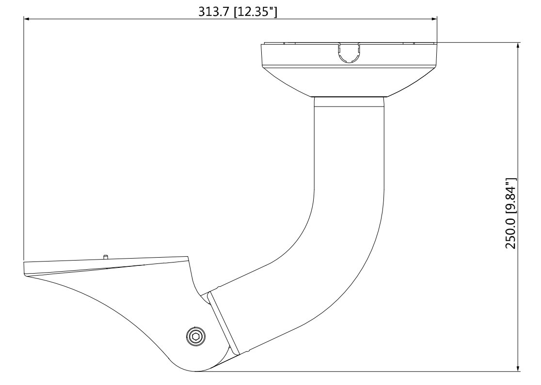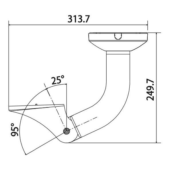 Montážní rameno pro umístění kamery na strop nebo rampu. Rozměry: délka 314 mm, výška 250 mm, průměr paže 133 mm, hmotnost 0,99 kg, zatížitelnost 3 kg.