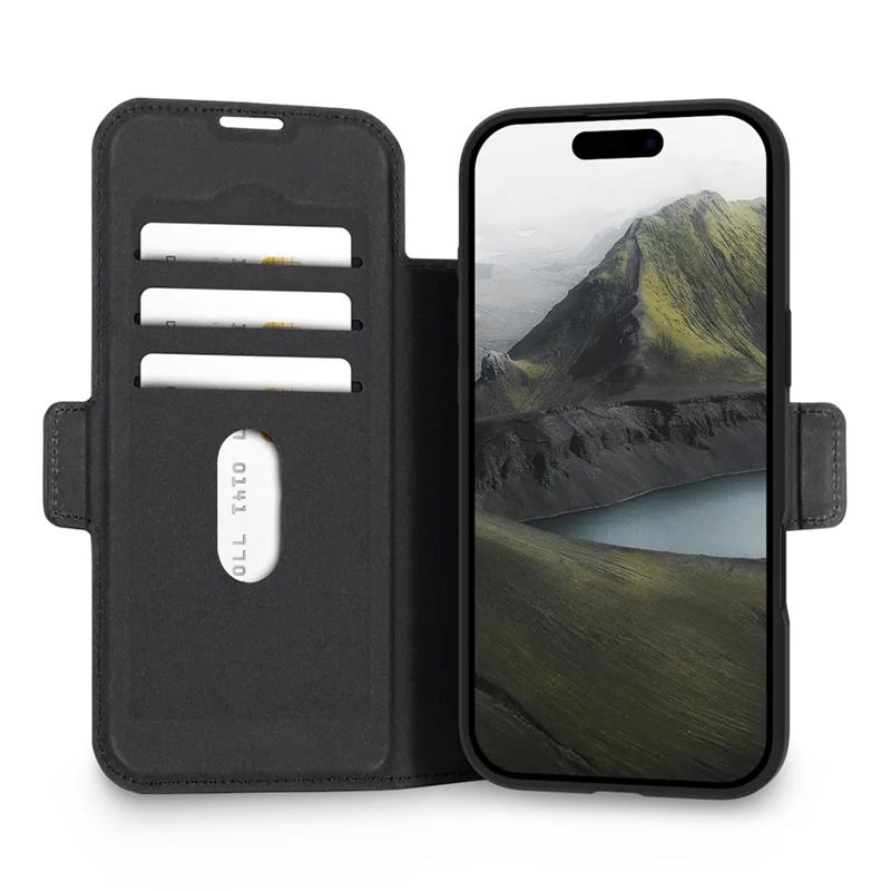 Kožené puzdro pre iPhone Air - extra tenké puzdro s elegantným nadčasovým dizajnom - vyrobené zo 100% recyklovanej vegánskej kože - v priebehu času vznikne na koži elegantná patina - praktické priečinky pre doklady, kreditné karty alebo hotovosť - uzatváranie pomocou magnetického pútka - plne prístupné porty, ľahko ovládateľné tlačidlá - kompatibilné s MagSafe a bezdrôtovým nabíjaním - určené pre iPhone Air