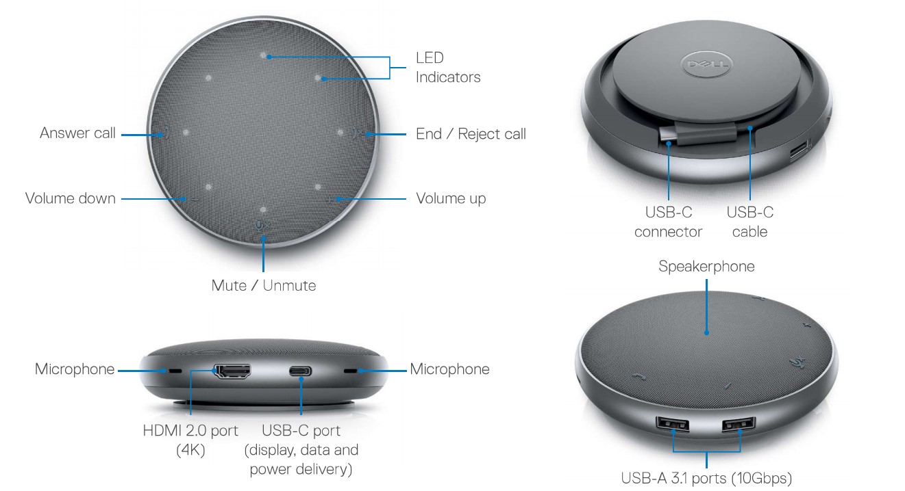 Mobilní adaptér Dell s mikrofonem a reproduktorem První adaptér 5 v 1 s více porty USB-C na světě s integrovaným mikrofonem a reproduktorem a průchozím napájením nabízí bezproblémovou konektivitu a řešení pro konferenční hovory. Hlavní vlastnosti * Rozměry: 119 mm x 32 mm (průměr x výška) * Hmotnost: 214 g * Připojení: USB-C * Typ kabelu: kulatý, 465 mm Porty * Kabel USB-C (data/napájení/video): 1 x víceúčelový kabel USB-C, který podporuje přenos dat, napájení, obraz a zvuk * Celkový počet portů: 1 x USB-C, 1 x HDMI, 2 x USB-A * Data Pory: 2 x USB-A 3.1 a 1 x USB-C 3.1, který podporuje přenos dat až 10 Gbps * Port napájení: 1 x USB-C, který podporuje dodávku energie do 90 W * Video Porty: HDMI 2.0: 4K (3840 x 2160) @ 60 Hz4 (podpora HDR) * Video Porty: USB-C: 4K (3840 x 2160) @ 60 Hz4 (podpora HDR) Další funkce * Podpora Plug & Play: Ano (bez instalace ovladačů) * Hlasitý telefon/reproduktor: Ano * Typ reproduktoru: Elektrodynamický reproduktor s neodymovým magnetem * Frekvenční rozsah: 200 Hz - 20 kHz * Pokrytí mikrofonem: 360 stupňů, všesměrové * Frekvence mikrofonu: 100 Hz - 10 kHz * Funkce: Zabudované potlačení ozvěny a redukce šumu, přijmutí hovoru, ukončen hovoru, odmítnutí hovoru, ztlumení (mute), regulace hlasitosti.
