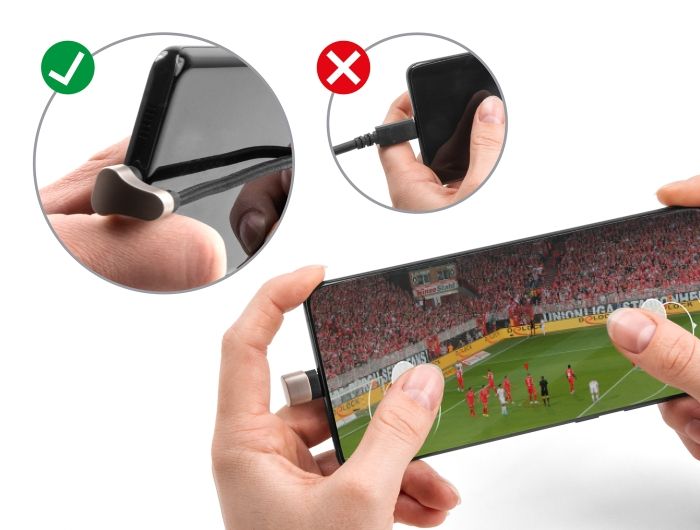 Tento kabel USB značky Delock umožňuje díky svému úhlu zalomení 180° současně hrát a nabíjet chytrý telefon. Díky tomuto praktickému úhlu je nabíjecí kabel vyveden za telefon a nepřekáží v hraní.
