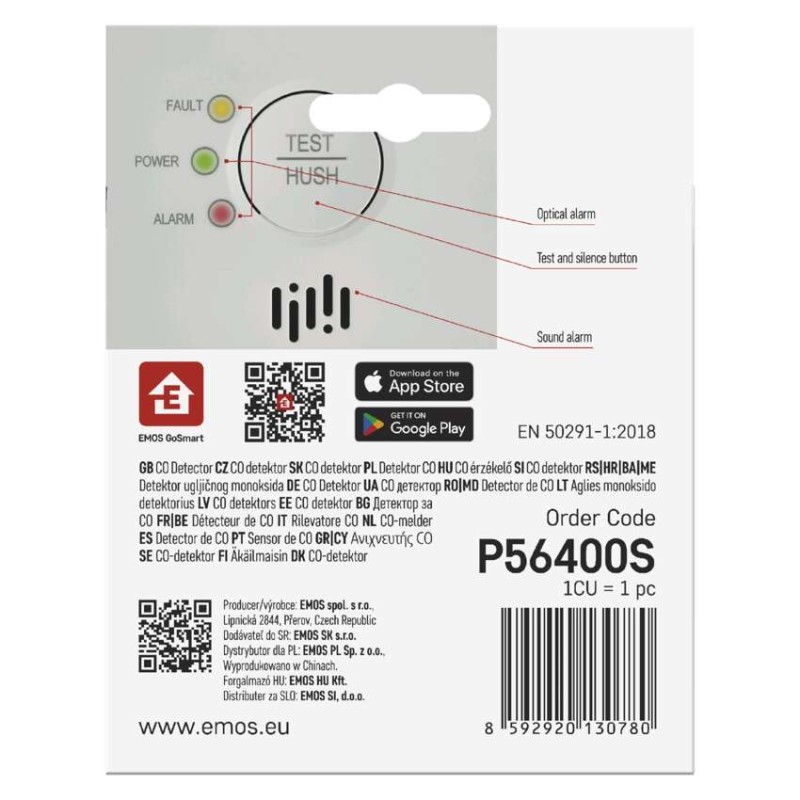 #: Android, iOS|#: nie|#: áno|#: EMOS GoSmart, TUYA, LIDL, Smartlife, otvorený systém|#: EN, CZ, SK, PL, DE, HU, SI, FR, + 60 ďalších jazykov|#: –|#: Wi-Fi|dosah modulu: neuvádza sa|hlasitosť signalizácie: >85 dB vo vzdialenosti 3 m|krytie: IP30|možnosť prepojenia s ďalšími detektormi: neuvádza sa|napájanie: 2× 1,5 V AA, súčasťou balenia|pamäť poplachov: áno|poplachová teplota: –|predajný obal: 1 ks, krabička|prenosová frekvencia: 2,4 GHz WIFI (IEEE802.11b/g/n)|prevádzková teplota: -10 °C až 40 °C|prevádzková vlhkosť: 15–93 %|rozmer: 93 × 30 × 93 mm|typ detekcie: detektor CO|typ inštalácie: montáž na stenu alebo voľne stojaci|typ signalizácie: optická aj zvuková|určené pre typ: neuvádza sa|životnosť: 10 rokov