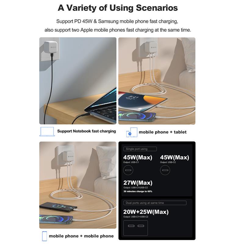 Sieťový adaptér 45W - vyrobené z odolných materiálov s dlhou životnosťou - sieťový adaptér s 2 vstupmi USB-C - poskytuje rýchle nabíjanie s výkonom 45W - USB-C1 port poskytuje 20W a USB-C2 25W - technológia GaN pre vysoký výkon a inteligentné nabíjanie - nabije iPhone z 0 - 50% za 30 minút - možnosť nabíjania dvoch zariadení súčasne - podpora Power Delivery a Quick Charge Výstup: USB-C1 / USB-C2 5V / 3A 9V / 3A 12V / 3A 15V / 3A 20V / 2.25A