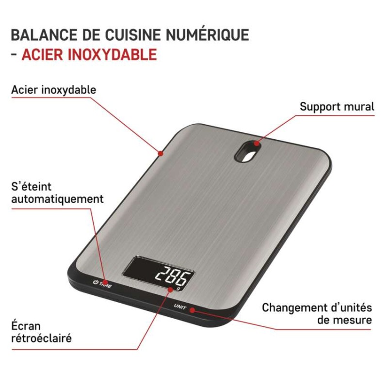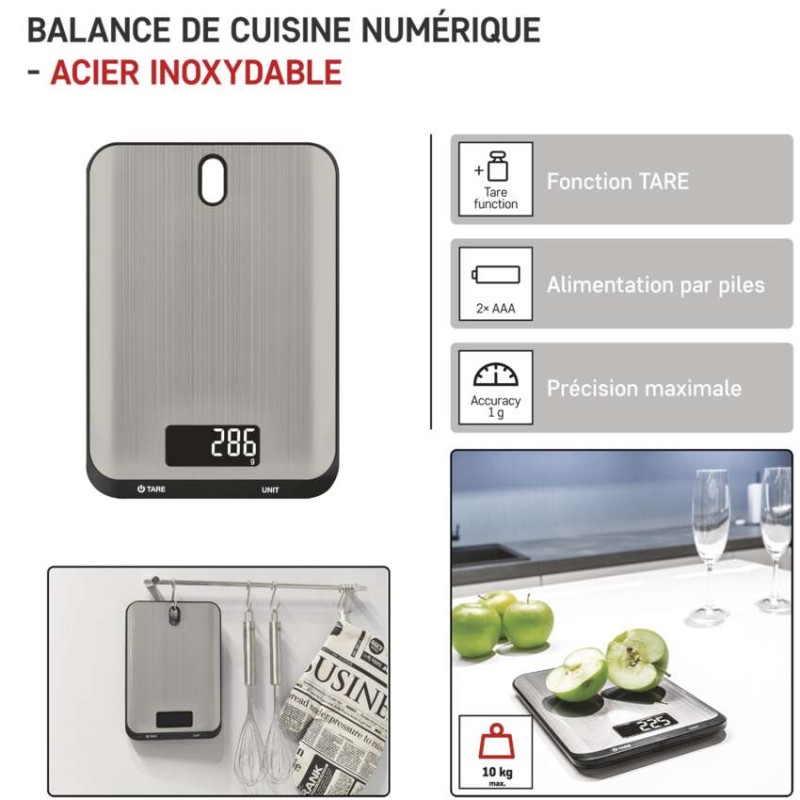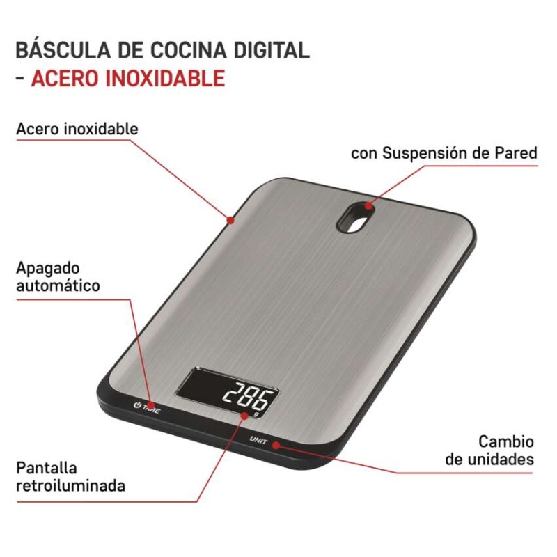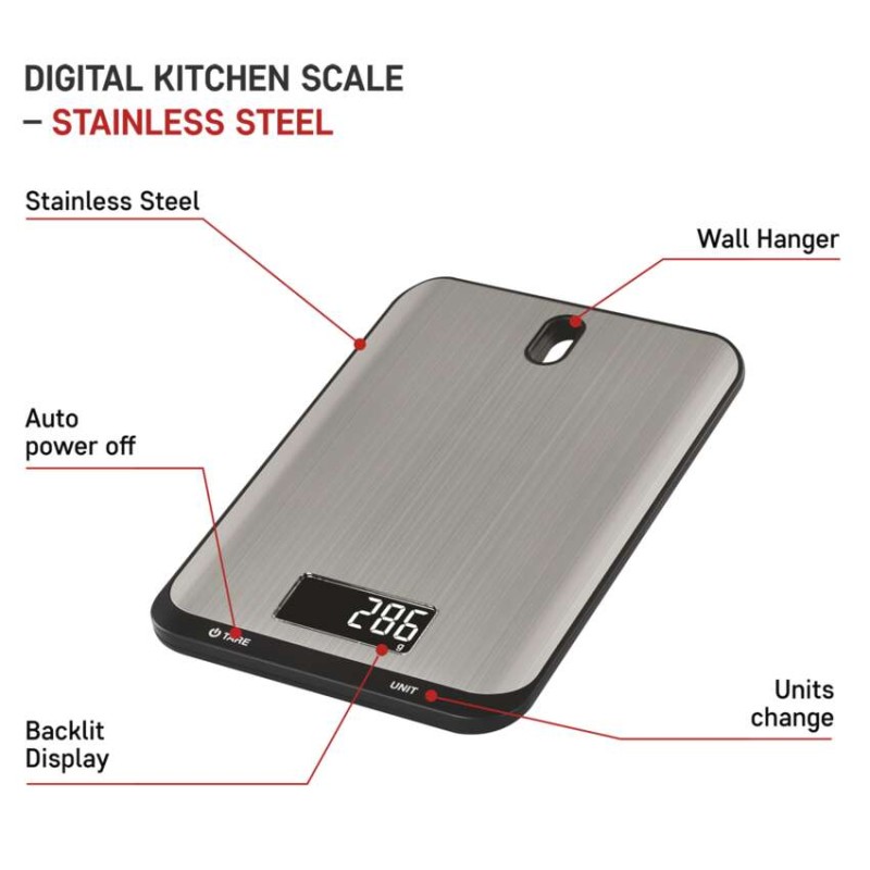 automatické vypnutie: po 90 sekundách|Bluetooth: nie|BMI index – meranie tuku, vody a svalovej hmoty: nie|farba: strieborná|funkcia dovažovania: áno|indikácia slabých batérií: áno|indikátor preťaženia: áno|jednotky váhy: g, kg, ml, oz, lb, tl|LCD displej: áno|max. záťaž: 10 kg|napájanie: 2× 1,5 V AAA (súčasťou balenia)|pamäť: nie|podsvietený displej: áno|povrch váhy: nerez|predajný obal: 1 ks, krabička|presnosť váženia: 1 g|produkt: kuchynská váha|rozmer: 15 × 153 × 212 mm