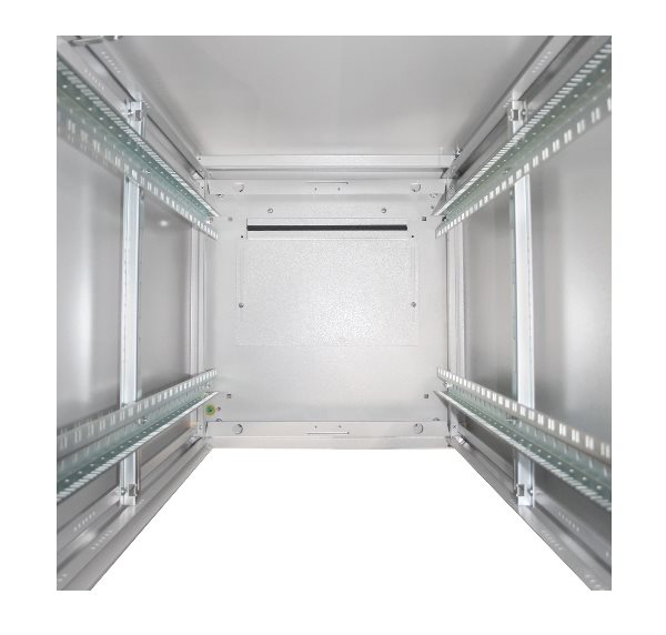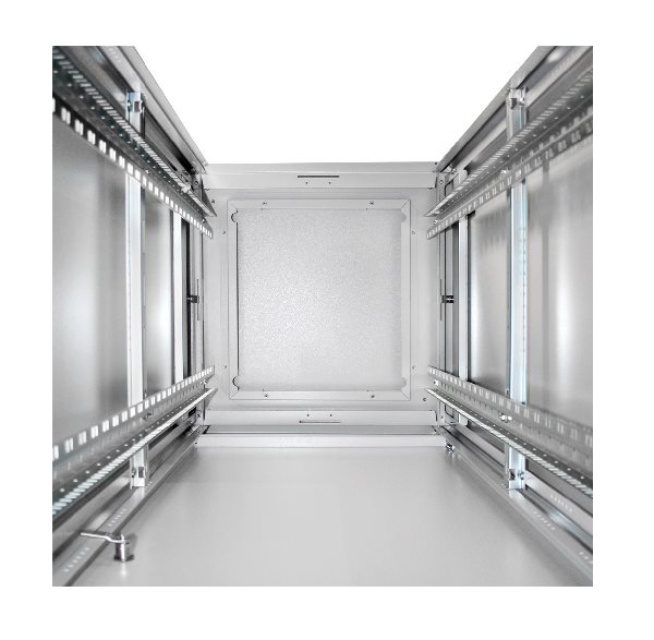 cabinet is equipped with galvanized 483 mm (19”) profile rails, mounted left and right on the front and rear side. They are