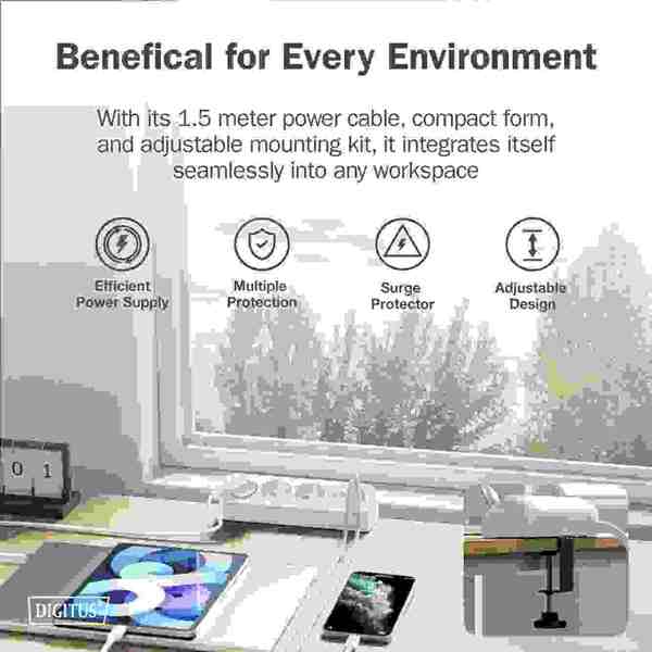 Vylepšete si pracovní prostor s tímto praktickým stolním prodlužovacím kabelem. Součástí dodávky je stolní svorka, která vám umožní umístit prodlužovací kabel kamkoli potřebujete. 1,5m napájecí kabel a kompaktní design usnadňují integraci do většiny sestav. Tři uzemněné zásuvky napájejí vaše zařízení přímo u stolu. Konstrukce s úhlem 45° umožňuje připojení větších zástrček, aniž by blokovala jiné zásuvky. Tři nabíjecí porty USB umožňují pohodlné nabíjení mobilních zařízení, ať už jde o chytré telefony nebo tablety. Integrovaná krytka a vylepšená ochrana proti kontaktu uzemněných zásuvek zajišťují vaši bezpečnost i bezpečnost ostatních a umožňují vám pracovat s klidem.